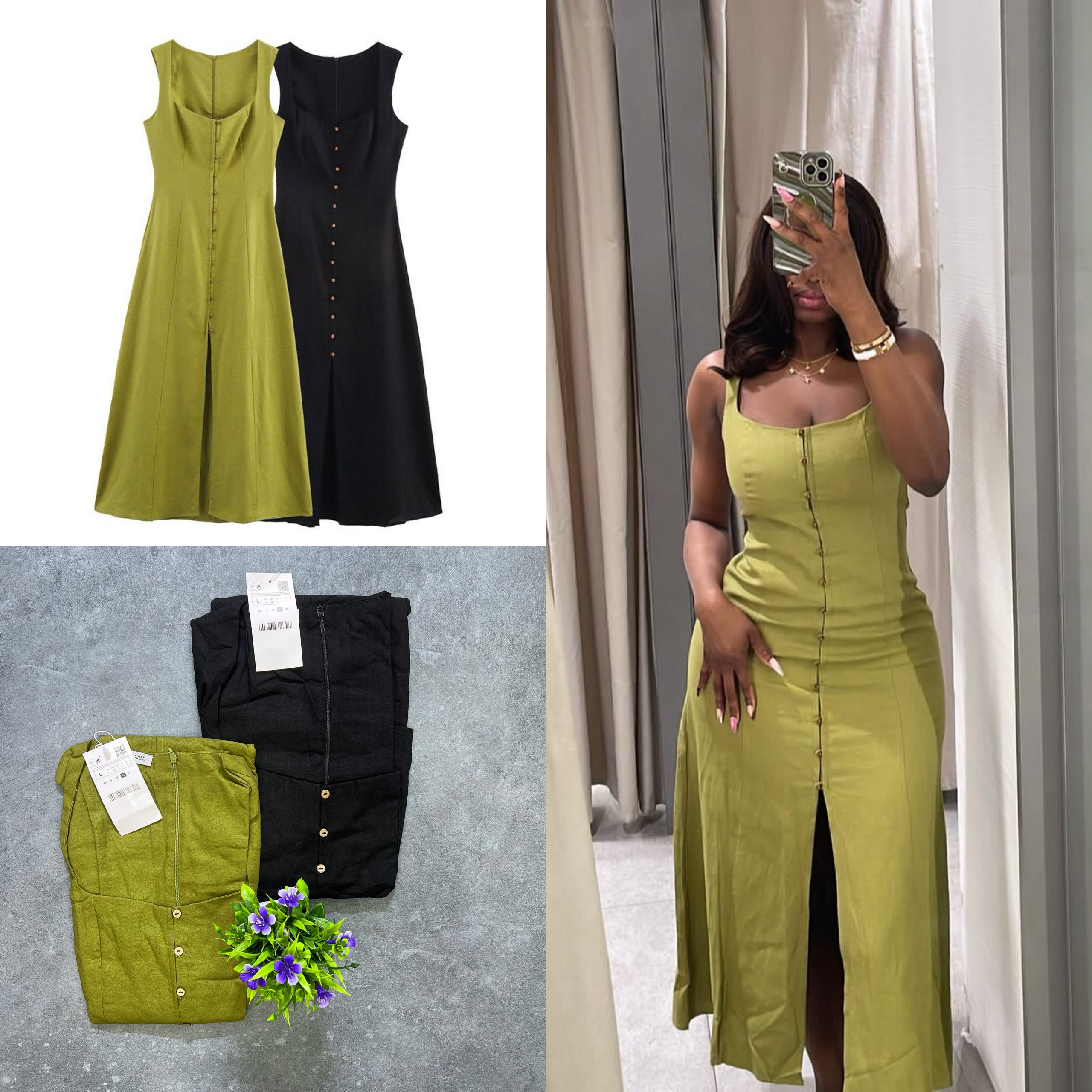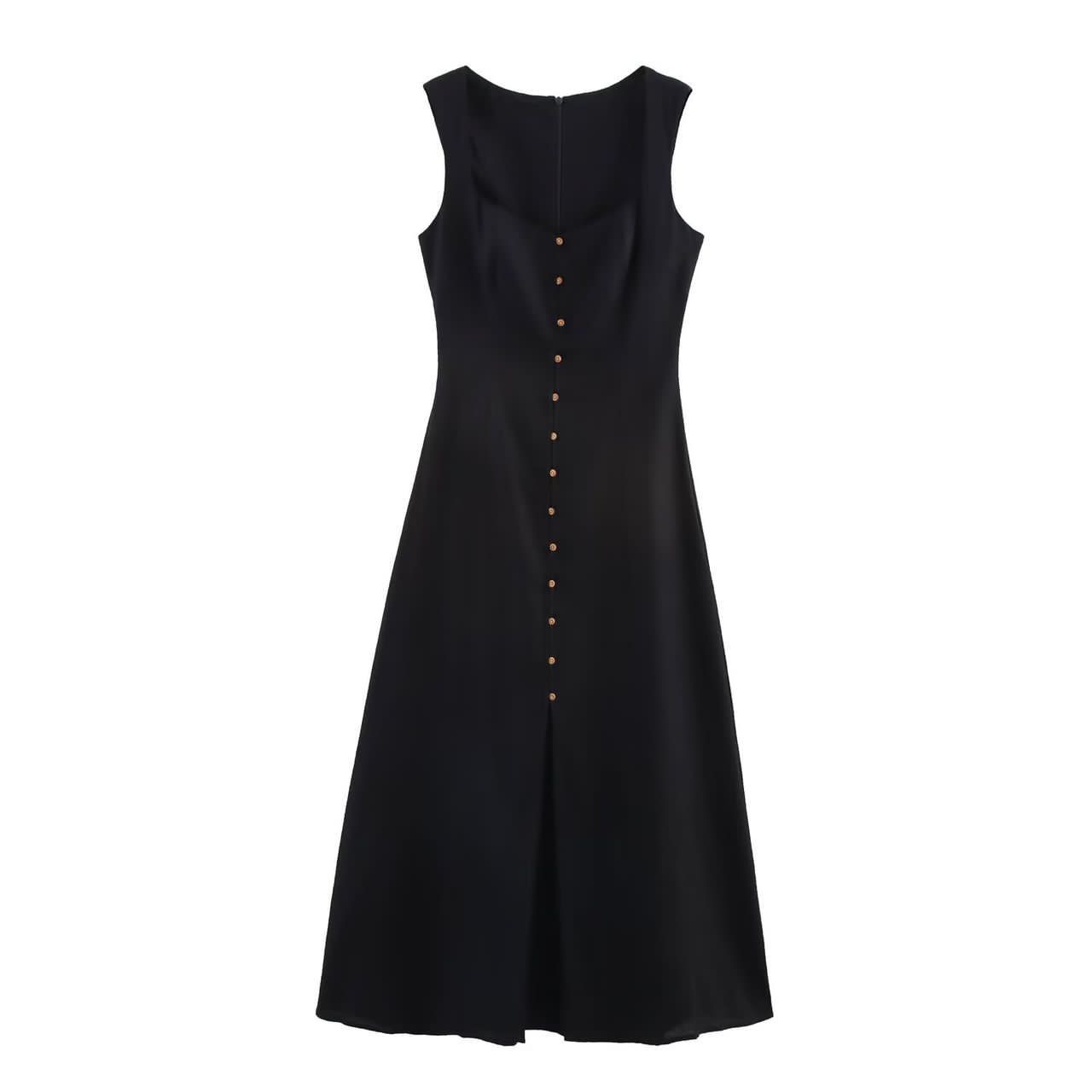 Pair it effortlessly with black pants for a trendy layered look or wear it solo for a statement piece. Don’t miss out on this versatile addition to your closet—embrace your style and make a lasting impression with our A-Line Sleeveless Button Front Maxi Dress today!