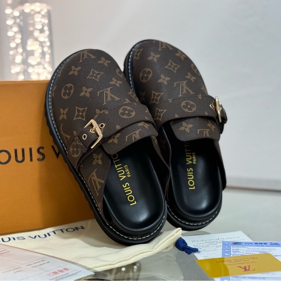 Indulge in the ultimate blend of luxury and comfort with the Louis Vuitton Monogram Slippers. These cozy flat comfort clogs are designed for those who appreciate the finer things in life while seeking everyday ease. Crafted from high-quality materials, the iconic Louis Vuitton monogram pattern adorns the exterior, making a bold statement that reflects your sophisticated taste. Slip into these stylish slippers and experience a plush interior that cradles your feet, providing unparalleled comfort whether you’re lounging at home or stepping out for a quick errand.