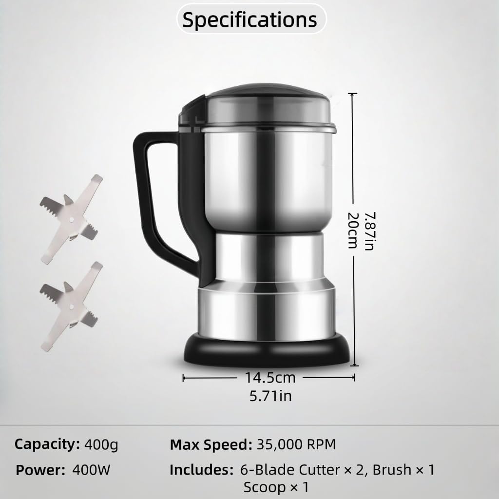 Industrial-Strength Powder Grinder Performance: Experience the power of a grinding machine! Powered by a 400W copper motor (35,000 RPM), this powder grinder delivers fine powder quickly, achieving a consistency comparable to that of a coffee grinder or an electric burr coffee grinder. Built-in protection systems prevent overheating, making it a reliable powerhouse. If interrupted, simply wait 2–3 minutes for the safety system to reset.