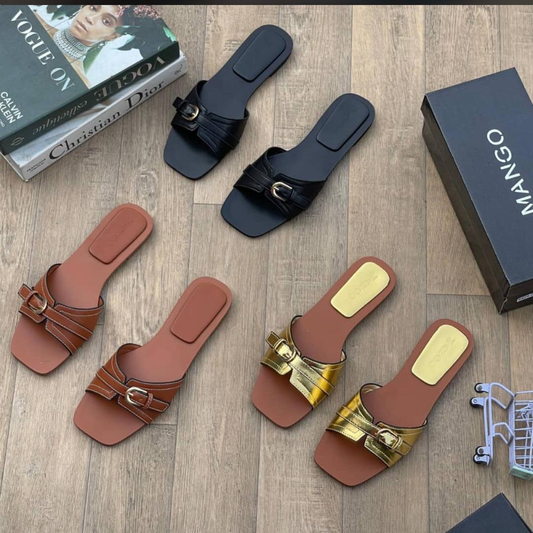 The standout feature of these Ladies Mango Slippers is the eye-catching gold buckles that add a touch of glamour and refinement. These stylish accents effortlessly elevate your look, making them the perfect accessory to complement both casual and dressy ensembles. Pair them with a flowy sundress .