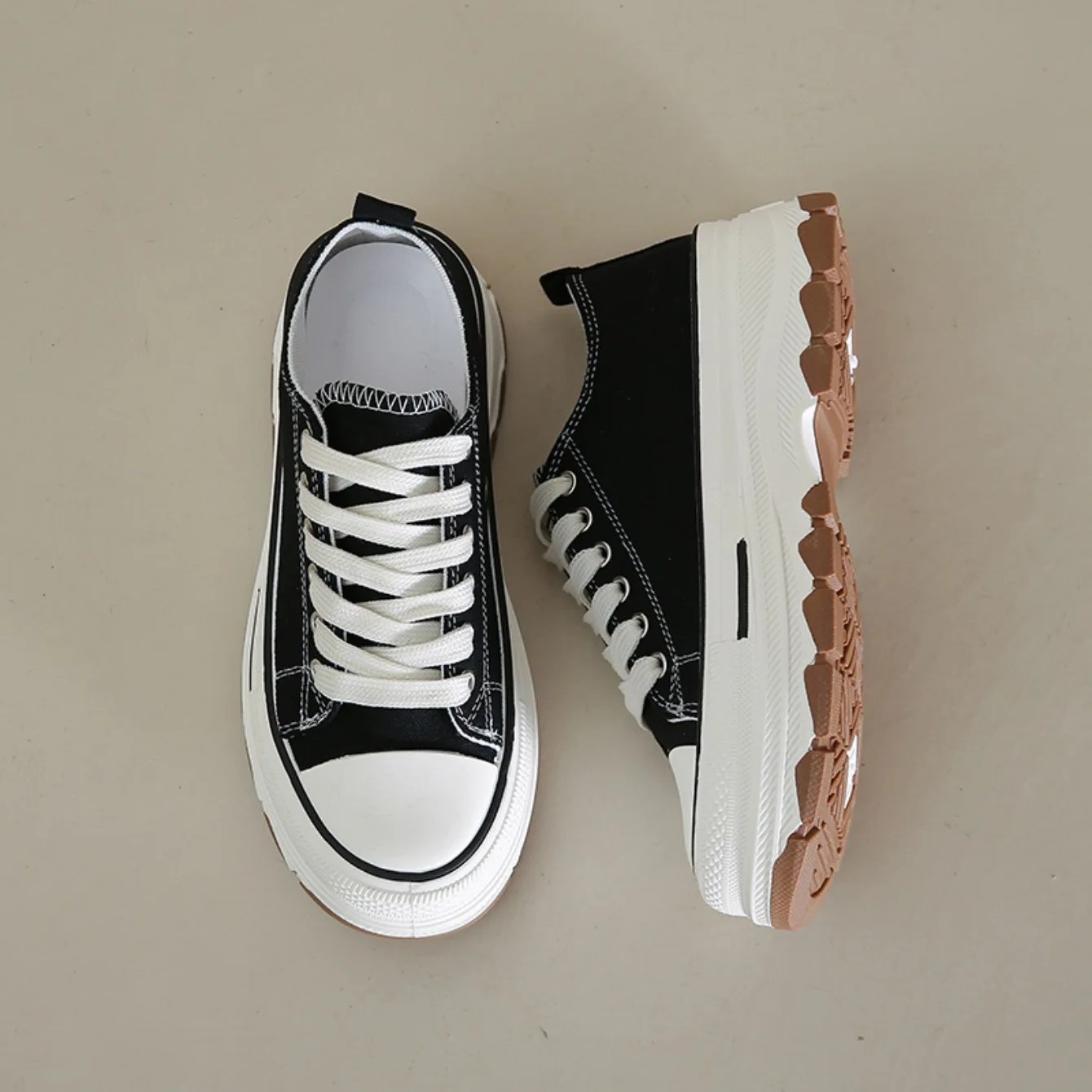 Step up your style game with our Ladies Thick-Sole Sneakers, designed for the modern woman who values both comfort and fashion. The striking black and white laces add a chic contrast to the classic canvas design, making these sneakers a versatile addition to any wardrobe. Whether you’re running errands or meeting friends for brunch, these sneakers will keep you looking effortlessly stylish.
