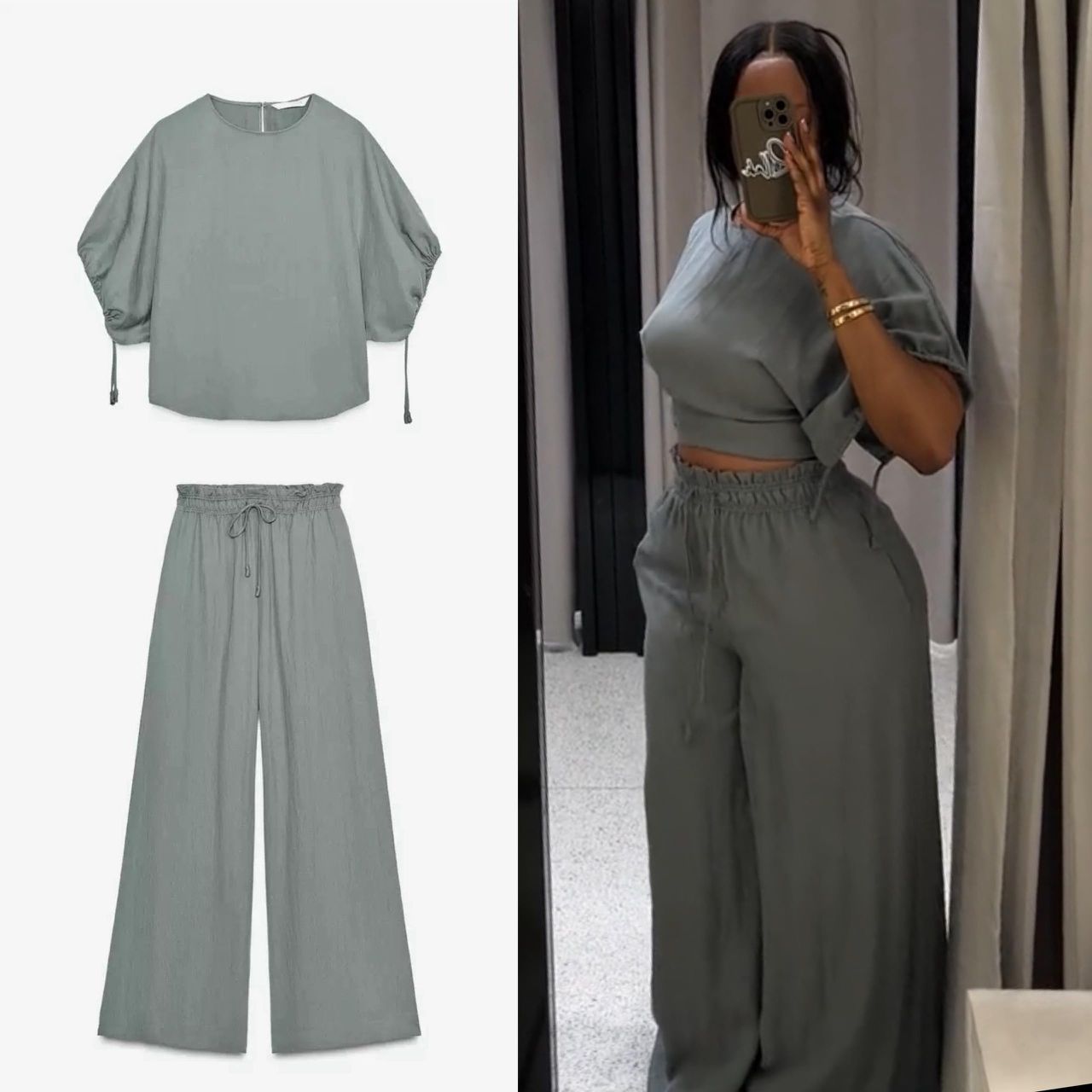 Elevate your casual wardrobe with our chic Ladies Two Piece Set, featuring a stylish green top paired with wide-leg pants. This effortlessly trendy ensemble is perfect for any occasion, whether you’re heading out for brunch or enjoying a cozy day at home. The soft, breathable fabric ensures all-day comfort while keeping you looking fabulous.
