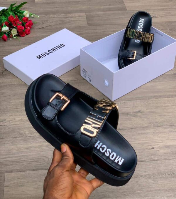Step into extravagance with these stunning LUXURY MOSCHINO SLIDE SLIPPERS FOR LADIES. Meticulously crafted with the finest materials, these slides are a testament to Moschino’s commitment to luxury and elegance. Treat your feet to the ultimate in comfort and style with these exquisite footwear that will have you feeling like royalty.