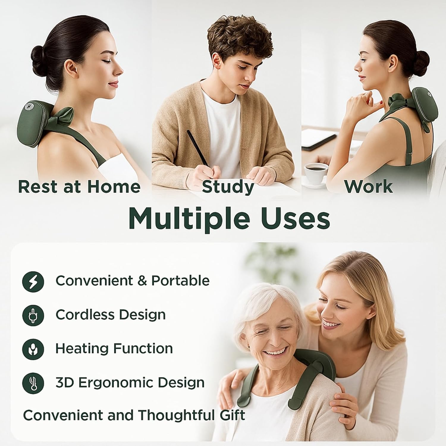 Made with food-grade silicone massage nodes, breathable PU leather, and a durable ABS housing, this electric Rechargeable Neck Massager is soft, safe, and non-irritating. The embossed coating is anti-fouling and wear-resistant, ensuring long-lasting performance. Anti-slip buttons prevent accidental operation, making it user-friendly for all ages.