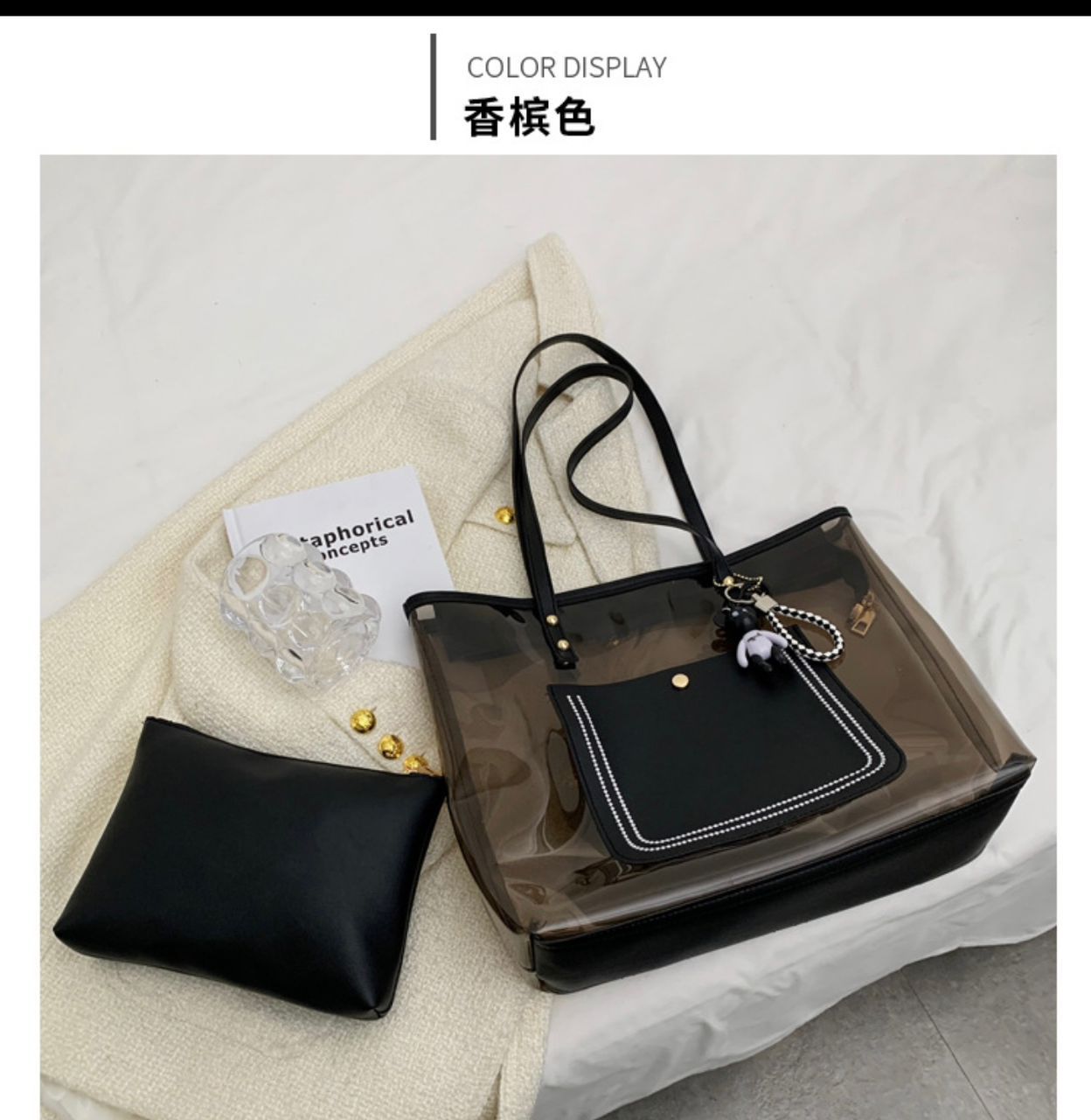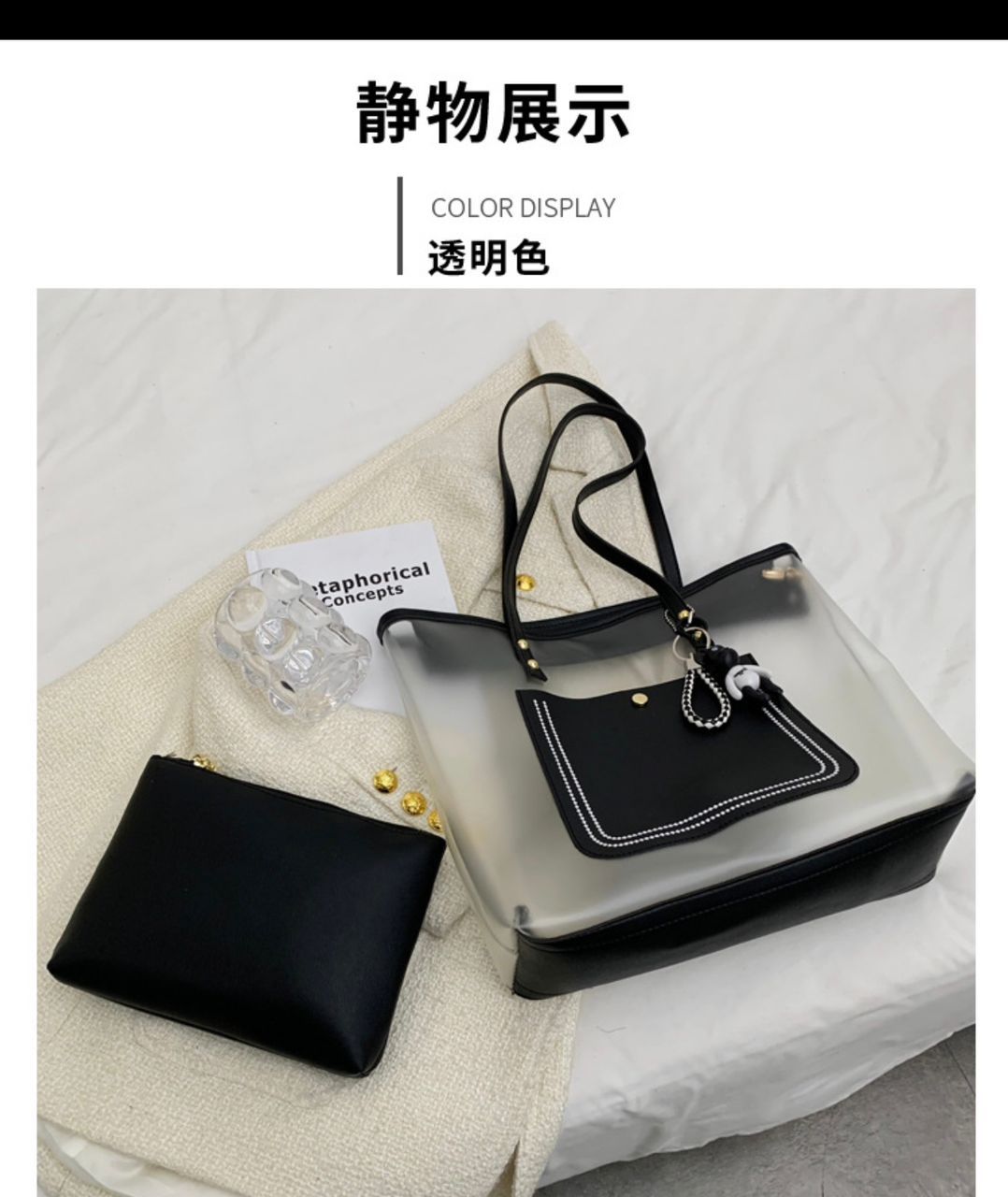 Introducing the Waterproof Transparent Totebag, the perfect blend of style and functionality for the modern woman on the go. This chic bag features a striking black and white design that effortlessly complements any outfit, making it an essential accessory for both casual outings and sophisticated events. Crafted from high-quality, durable materials, this tote is not only visually appealing but also built to withstand the elements, ensuring your belongings stay safe and dry no matter the weather.