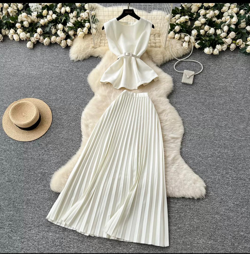 Accessorize with a chic hat, making it an ideal choice for outdoor events, brunches, or casual outings. The bold colors allows for versatile styling options, enabling you to pair it with your favorite accessories and footwear. Whether you’re dressing it up with heels or keeping it casual with flats, this Women Sleeveless Top and Pleated Skirts Suit is sure to turn heads.