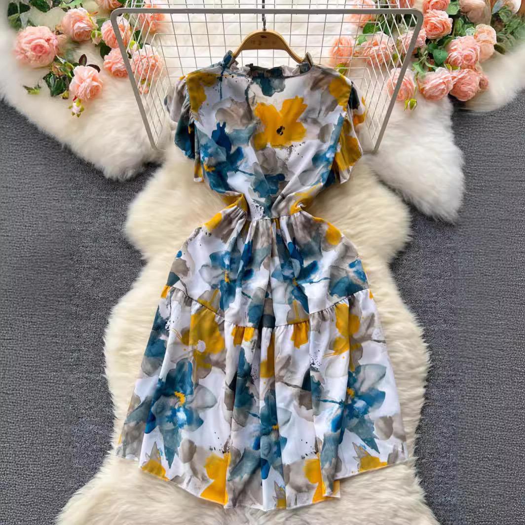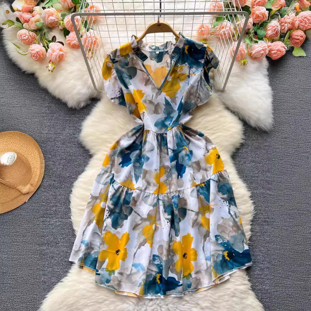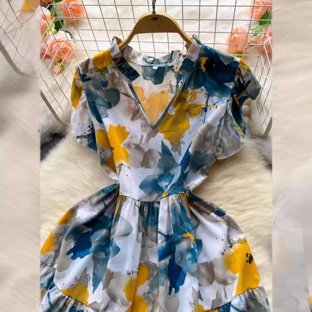 - Feature: Floral Print, Ruffle Hem, Notched V Neck, Flutter Sleeve, High Waist, A-Line, Knee Length, Boho Swing Dress for Women